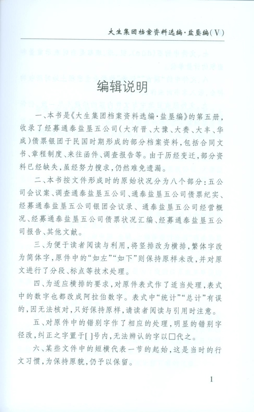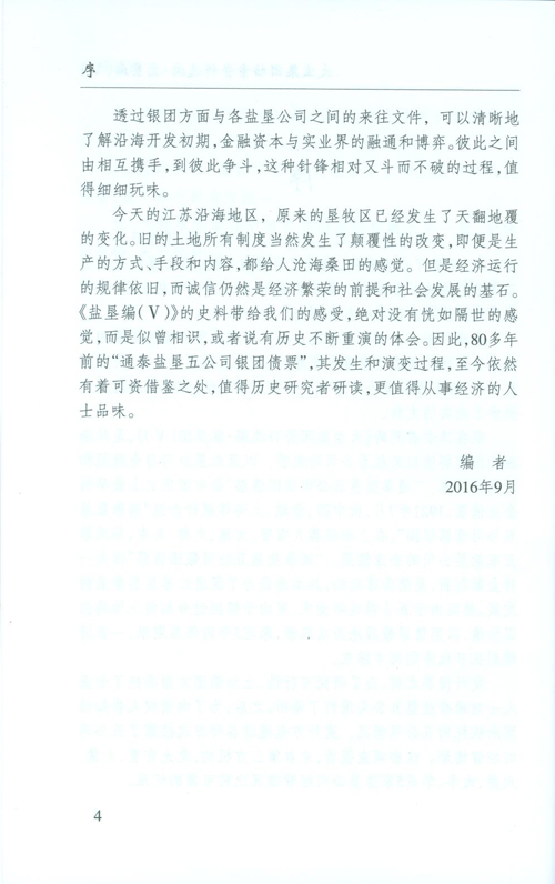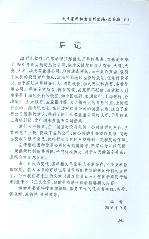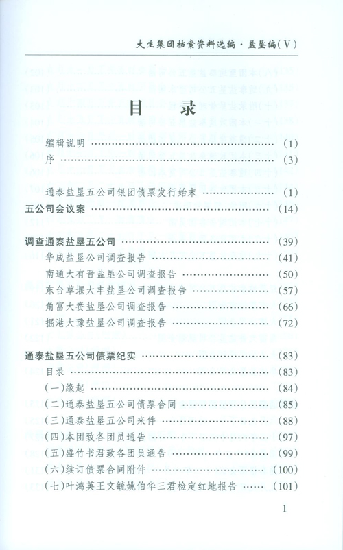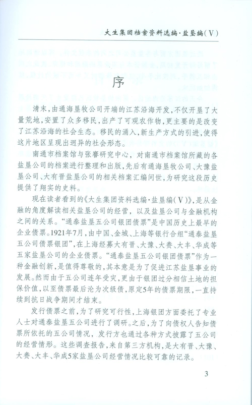 《大生集团档案资料选编·盐垦编(Ⅴ)》,是从金融的角度解读相关盐垦公司的经营,以及盐垦公司与金融机构之间的关系。“通泰盐垦五公司银团债票”是中国历史上最早的企业债票。1921年7月,由中国、金城、上海等银行合组“通泰盐垦五公司债票银团”,在上海经募大有晋、大豫、大赉、大丰、华成等五家盐垦公司的企业债票。“通泰盐垦五公司银团债票”作为一种金融创新,是值得尊敬的,其本意是为了促进江苏盐垦事业的发展。然而由于五公司连年受灾,更由于银团过分相信土地的担保价值,以至债票最后沦为次级债,原定5年的债票期限,一直持续到抗日战争期间才结束。